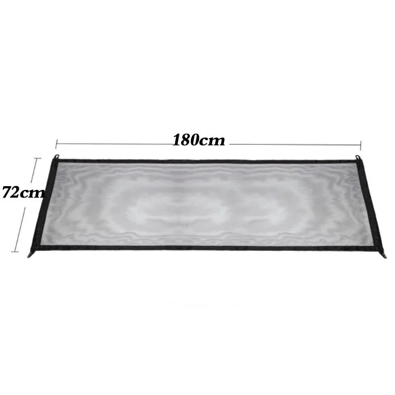 This gate is 72cm tall and expands to 110 cm/180cm wide - Pet safety enclosure perfect for doorways, between walls, or stairwells, indoors and outdoors - Built with tough partially see-through woven mesh fabric woven to withstand abuse from pets - Unique woven barrier that easily retracts to fully or partially quick pass-through - Completely assembled for immediate use. No tools required - Lightweight and portable to meet all your on-the-go needs - Each Set Includes one fabric woven, two stretchable poles and four sticky hooks Package List: 1 x Pet Separation Net 2 x Telescopic Rods 4 x Hooks
